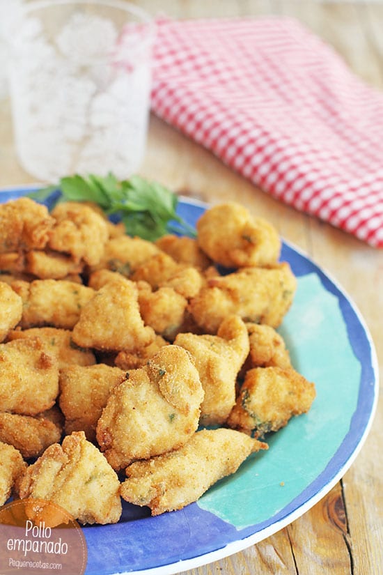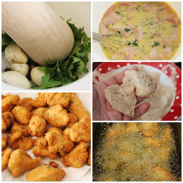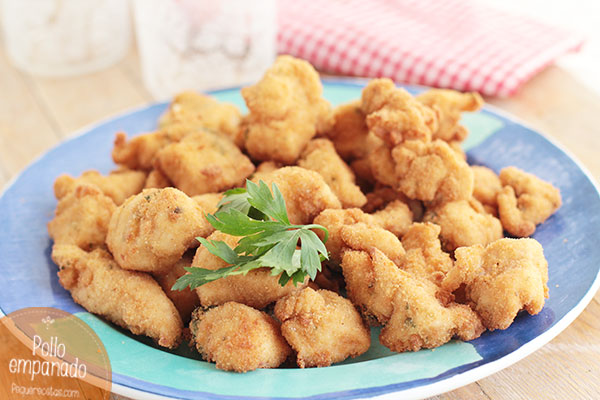 Ponemos en el mortero los dientes de ajo, la sal, el perejil y unos granos de pimienta negra y lo machacamos bien. En un cuenco o recipiente batimos los huevos, añadimos la leche y el majado. Cortamos el pollo en tiras o en trozos, como más os guste, y lo ponemos en la mezcla anterior. El pollo debe quedar totalmente cubierto. Tapamos y metemos en el frigorífico, al menos un par de horas. Pasado este tiempo, vamos sacando los trozos, rebozamos en el pan rallado y freímos en abundante aceite bien caliente hasta que estén dorados. Los sacamos y dejamos sobre papel de cocina absorbente. Servimos en el momento o cuando vayamos a tomarlo, el pollo empanado ¡está bueno tanto caliente como frío!